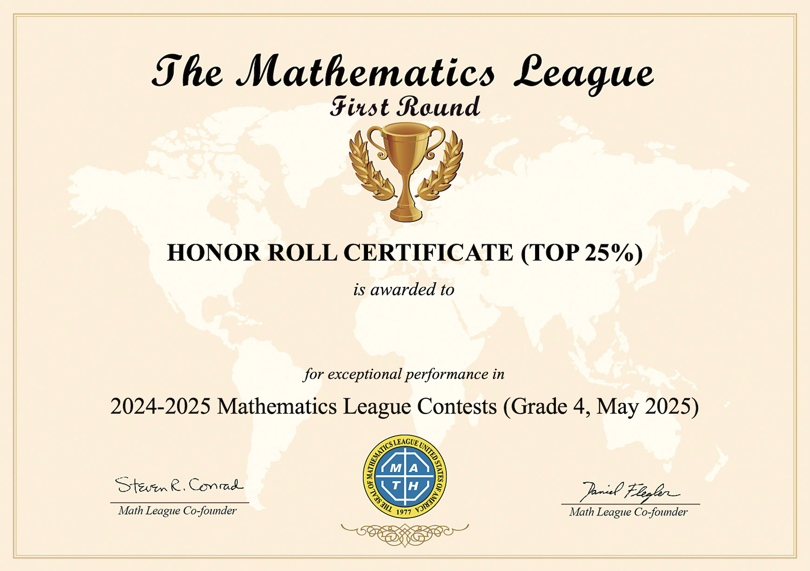 ![]() | Honor Roll Certificate Top 25% 頒發給成績前25%的學生 |