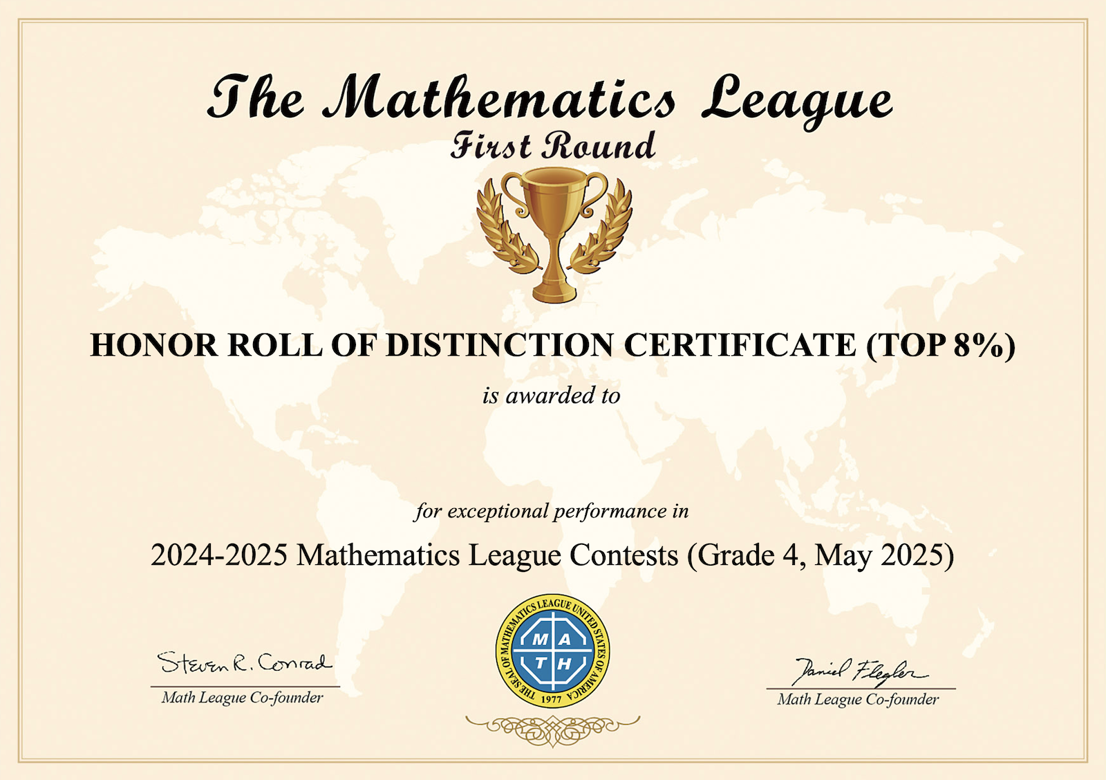 ![]() | Honor Roll of Distinction Certificate Top 8% 頒發給成績前8%的學生 |