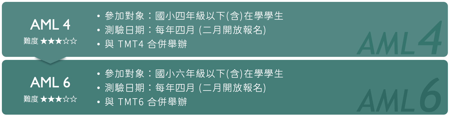 AML4/6 每年皆與 TMT4/6 合併舉辦,可參考TMT台灣中小學數學能力檢定之常見問題。
