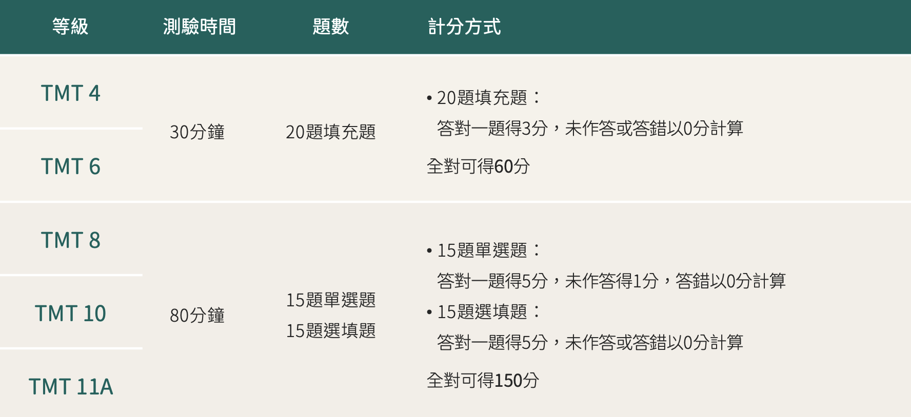 TMT各等級之測驗時間、題數與計分方式資訊如下: