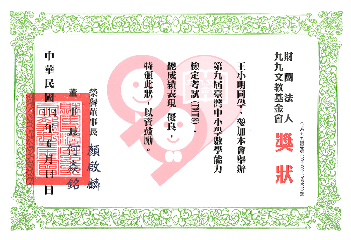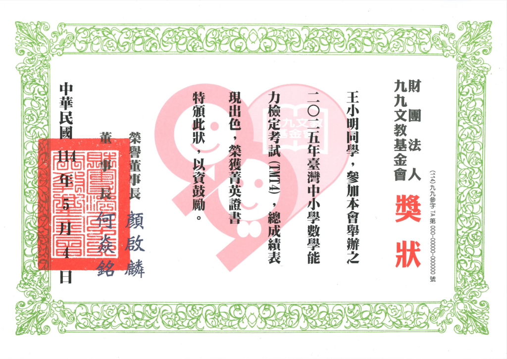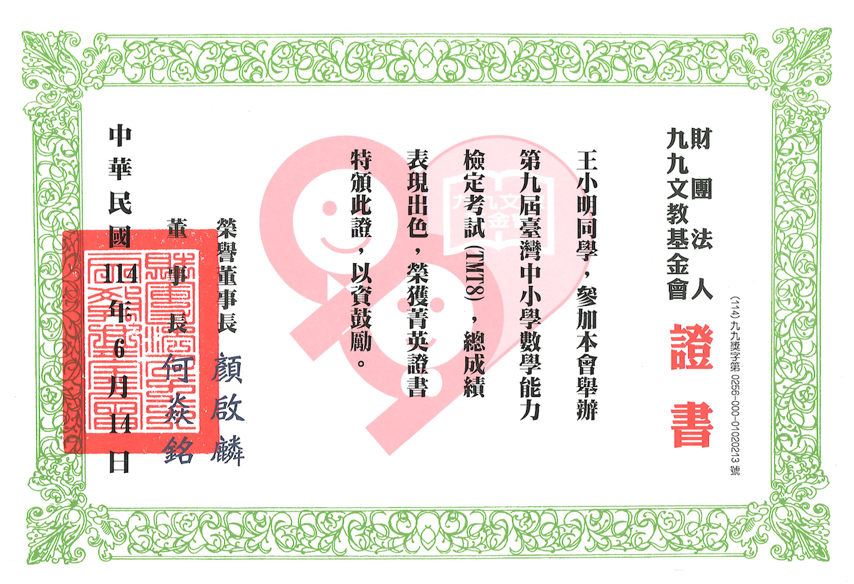 ![]() | 菁英證書 凡國小三年級以下(含) 全國成績排序在前 20% 之考生 可獲得菁英證書乙份 |