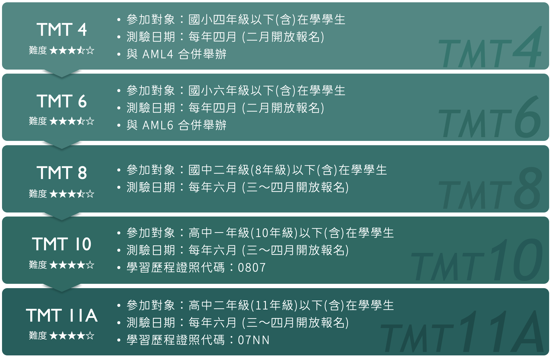 - TMT6:臺灣國小六年級以下(含)數學課綱為命題範圍