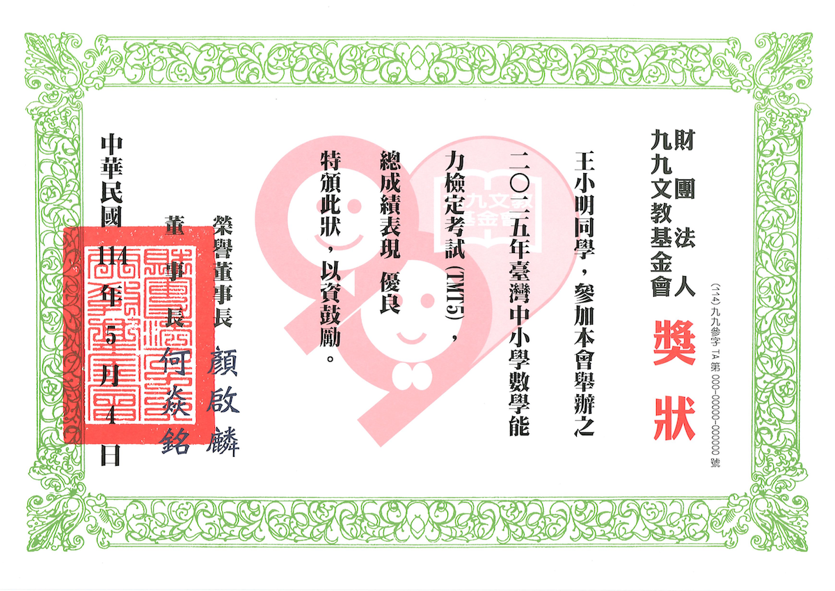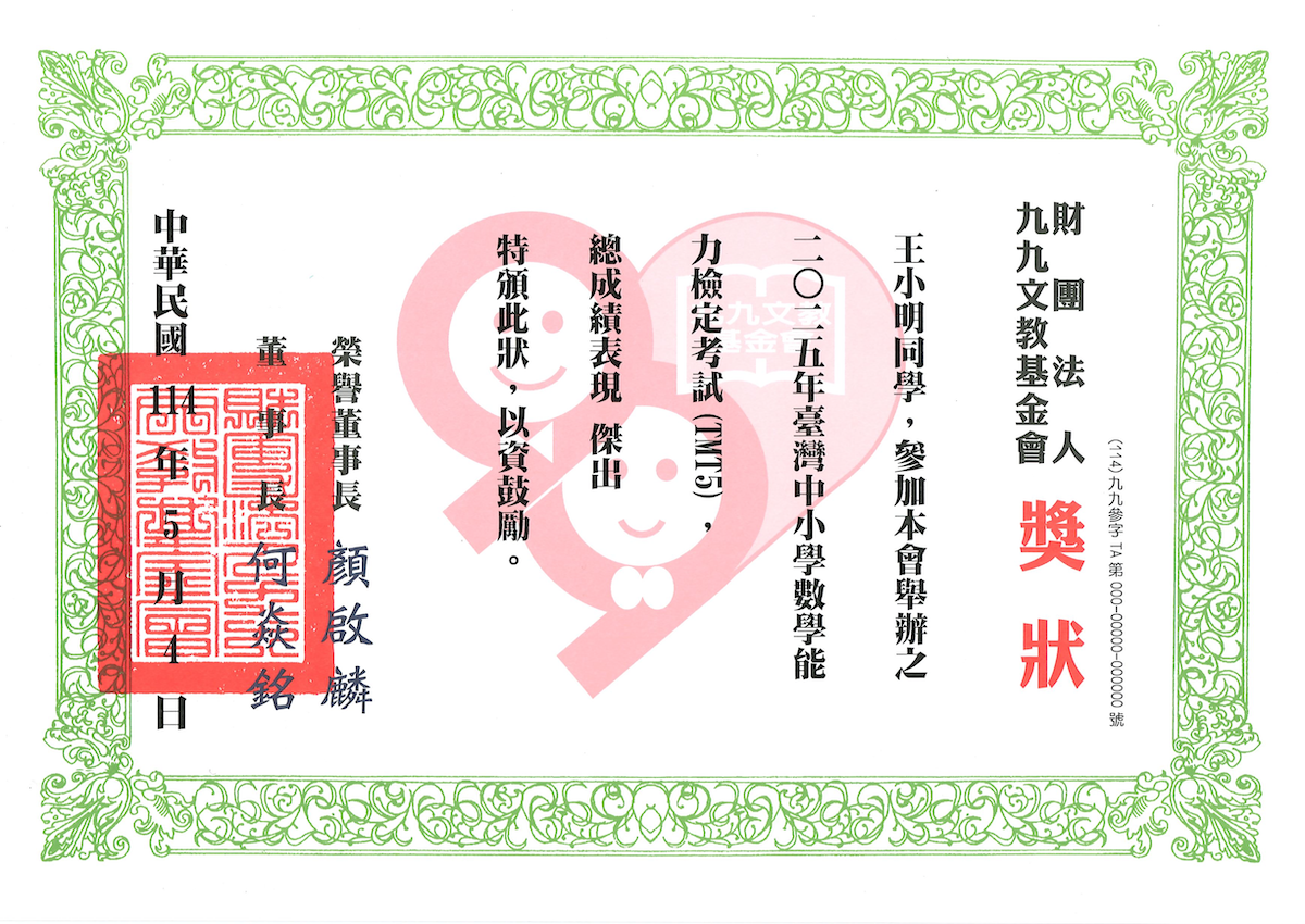 ![]() | 傑出證書 全國成績排序在前 3% 之考生 可獲得傑出證書乙份 |
