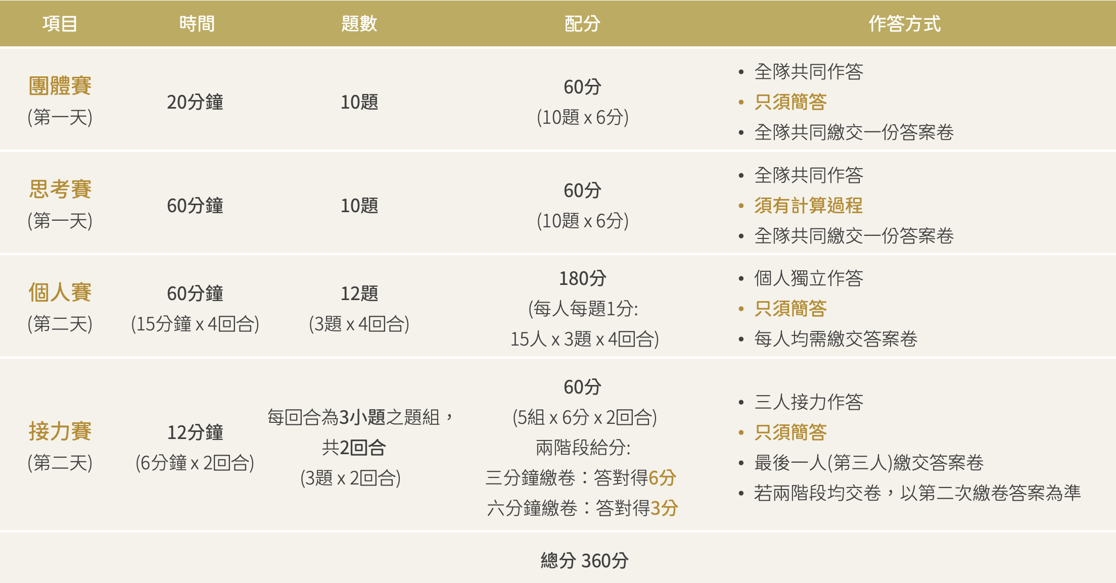 - 17:00 ~ 20:00 試務 – 閱卷會議 (思考賽閱卷人員均須參加閱卷工作)