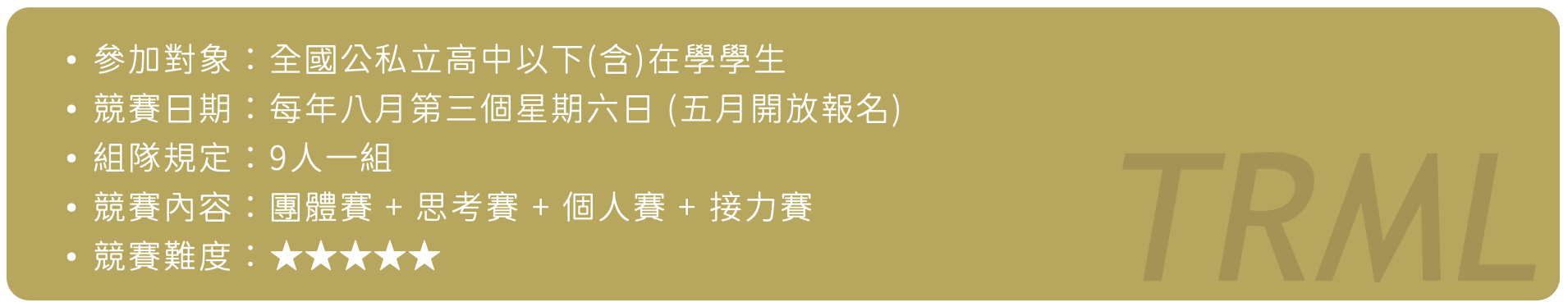TRML高中數學競賽為一團隊活動,因此我們僅受理【一個隊伍】以隊為單位繳費。